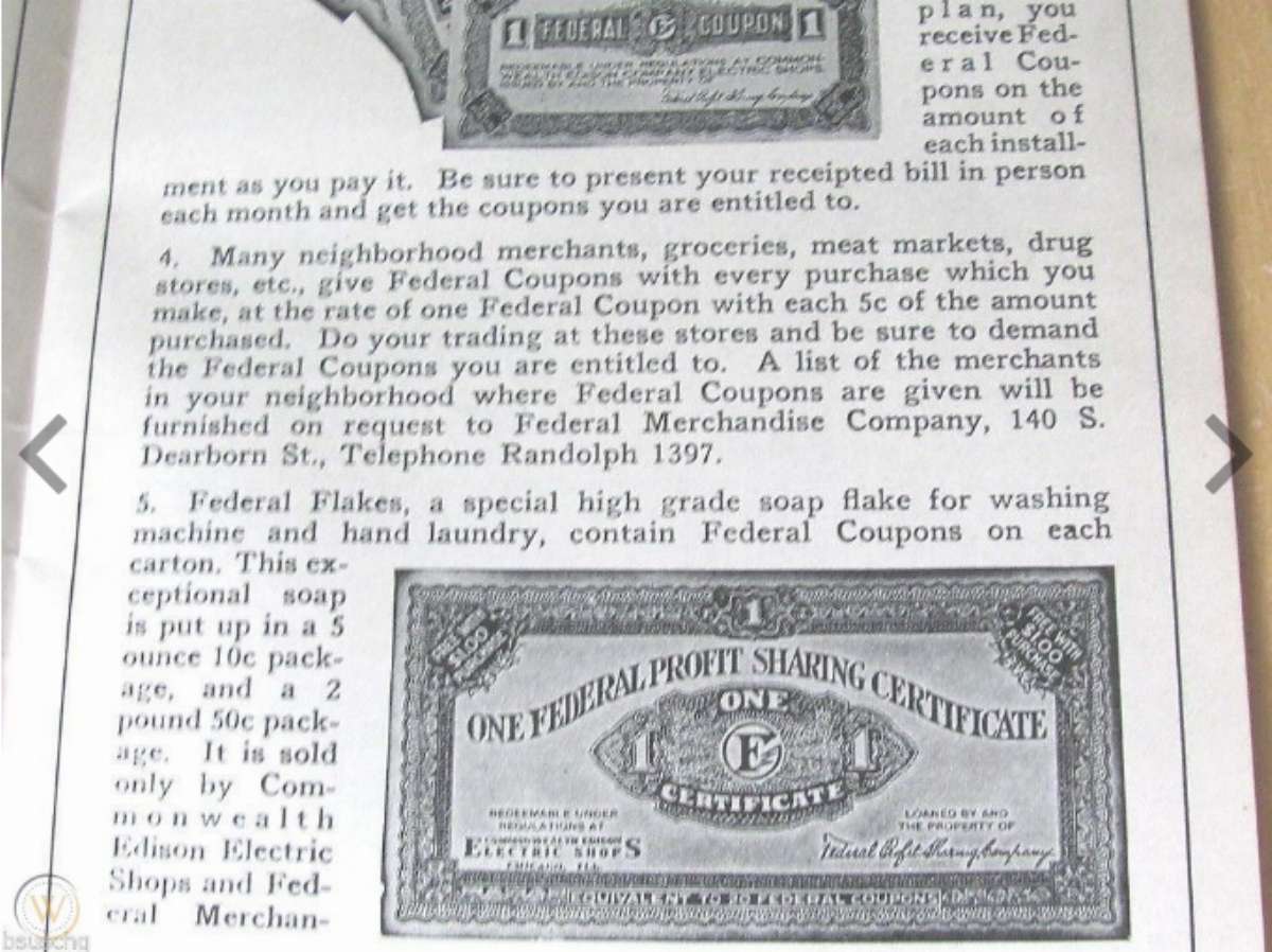 Evidently Commonwealth Edison had an electrical goods store and took these coupons which were similar to the later Green Stamps. I couldn't find any informatiuon about the Federal Merchandise Company, but did find some pictures of a 1930 catalog: