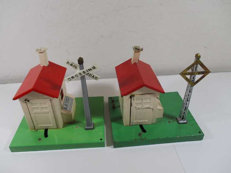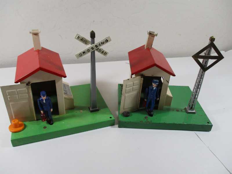 The one on the left is from 1941-42 and has regular 45N green base - this is the 45 that gives the shade of green it's name, plastic man with one moving arm, decal on toolbox, and solid post. The gray post helps date the gateman. I don't think the finial is correct.