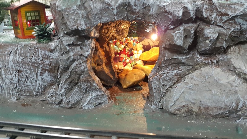The mountain area on the Lake Shore Railway is near completion. It has been painted, grassed, populated with trees/shrubs, houses/stations/power station and a few cast iron vehicles. Lamp posts and lights in the houses have been wired. One end features the menacing ceramic house of a mad scientist complete with flashing lights inside. Most landscaping around the Franken-house is noticeably dead, and who knows what flows from the waste culvert at the base of the mountain.