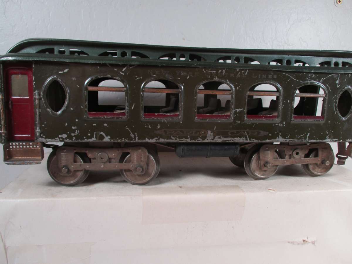 The roof on the new car is obviously repainted. Notice the side color is slightly different. The Parlor car is more of a true dark olive while the earlier pullman is more dark green. I think the paint formulation was changed in about 1914 or so. All of my items from before about 1913 and before are the darker more grainy paint.
