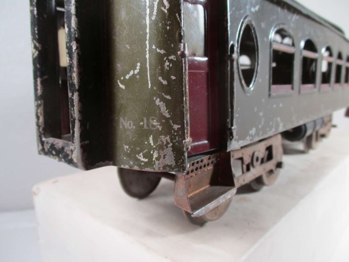 18 pullman car with straight couplers, perforated steps, "No. 18" and Lionel Lines stamps on ends and "Parlor Car" on sides. This car does not have cut away bolsters or primer.