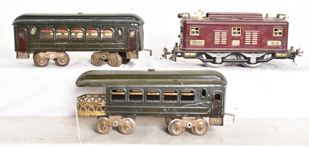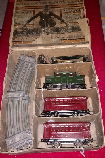 The Lionel 249E is in great shape, and the tender is cleaner. It's a 1939 era loco that came with low coupler 2651 series cars or maybe the 2717 litho cars in an uncataloged set. Easily worth $125.