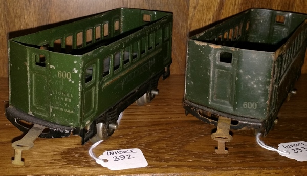 All three 35 pullmans shown have different methods of making the steps. The first perforated steps are individually made and then soldiered to the car floor in the corners. The first type of 3-hole step has two steps as one unit soldiered on to the bottom of the car. You can see a line going across the bottom of the car between the inward edges of the doors. The 18/19/190 and 180 series cars are made this same way. The whole step subassembly becomes the floor of the vestibule.