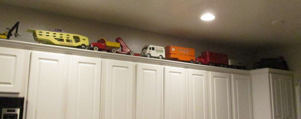 I have 1954-62 Tonka trucks above my kitchen cabinets: