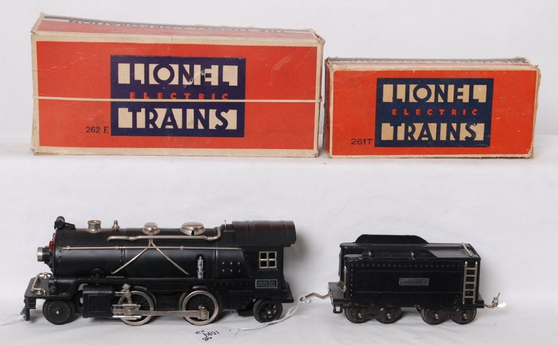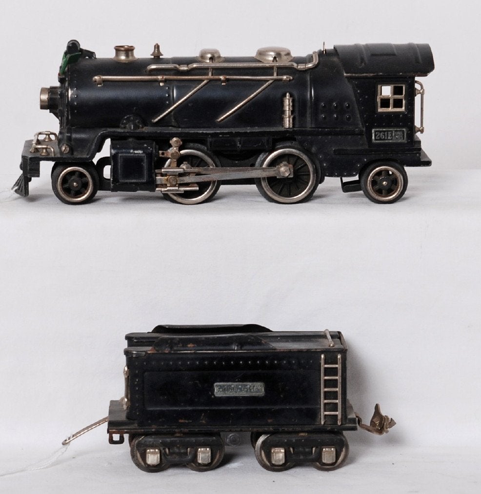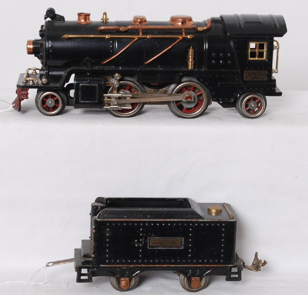 In 1934 the 262E was shown in the catalog with brass trim for separate sale with a 261T. Came in sets with terra cotta 613 cars and with 800 series freights. Same loco as the first 262 shown but with a 8-wheel tender.