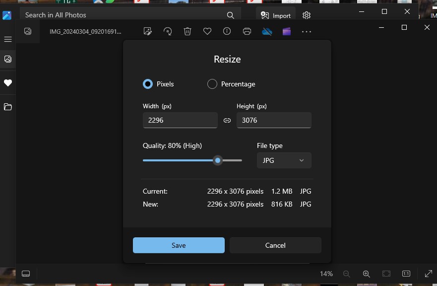WINDOWS 10 Photo ProgramIn Windows 10 photo viewer, with the photo open select the settings . . . then select RESIZE (3rd down). In resize you can save as option C define custom Demensions. Select 1200 for width which should set height to 900 automatically, Check MAINTAIN Aspect Ration, and with the quality slider select a value between 40-80%.