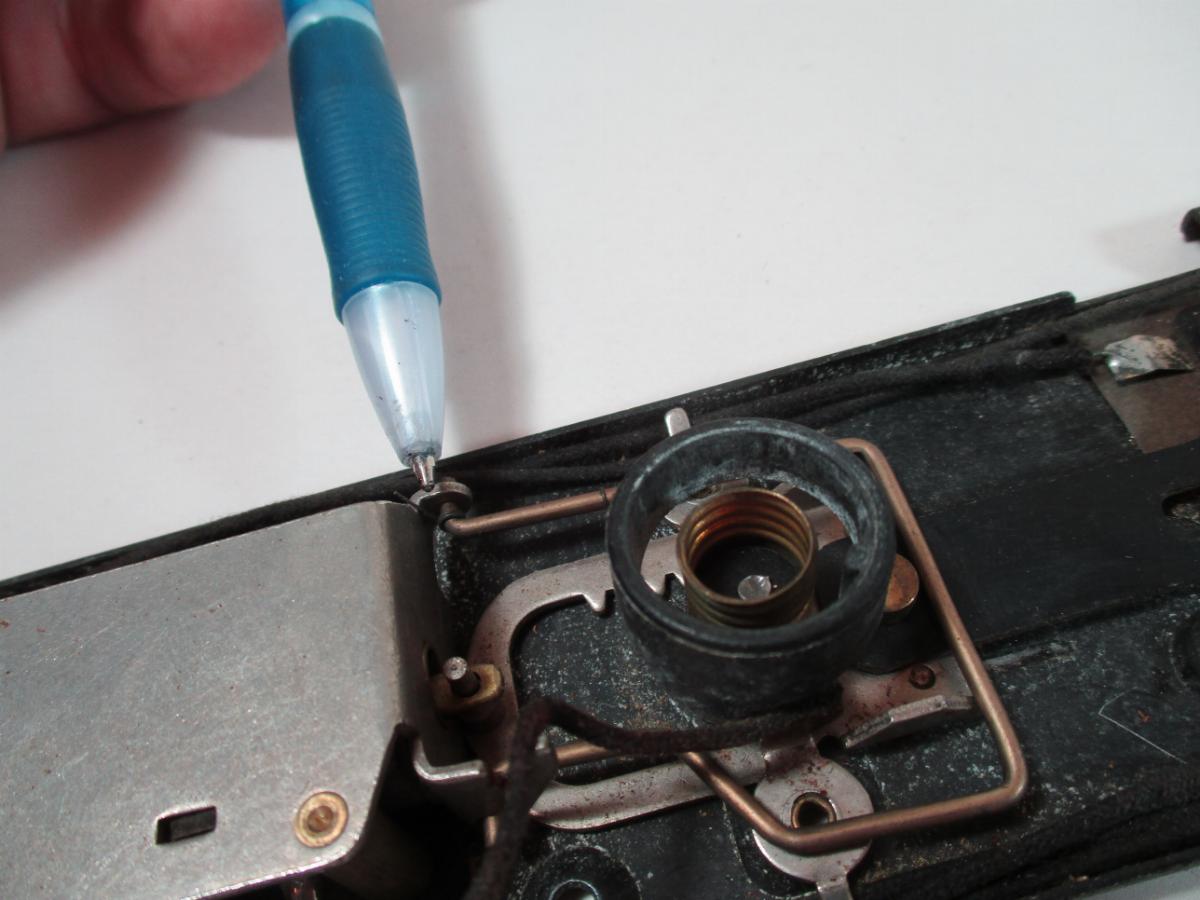 The next thing you do is check the spring that holds the lock down. It rarely breaks, but sometimes it's off or gone. It's shown in the photo below in the proper position.
