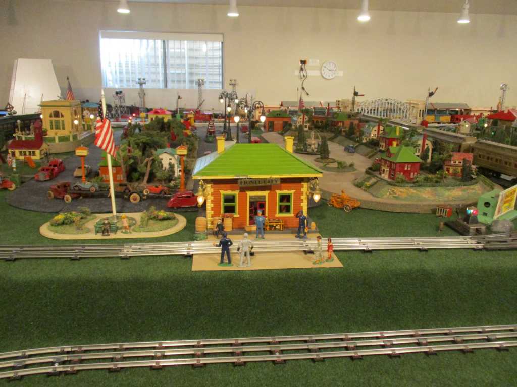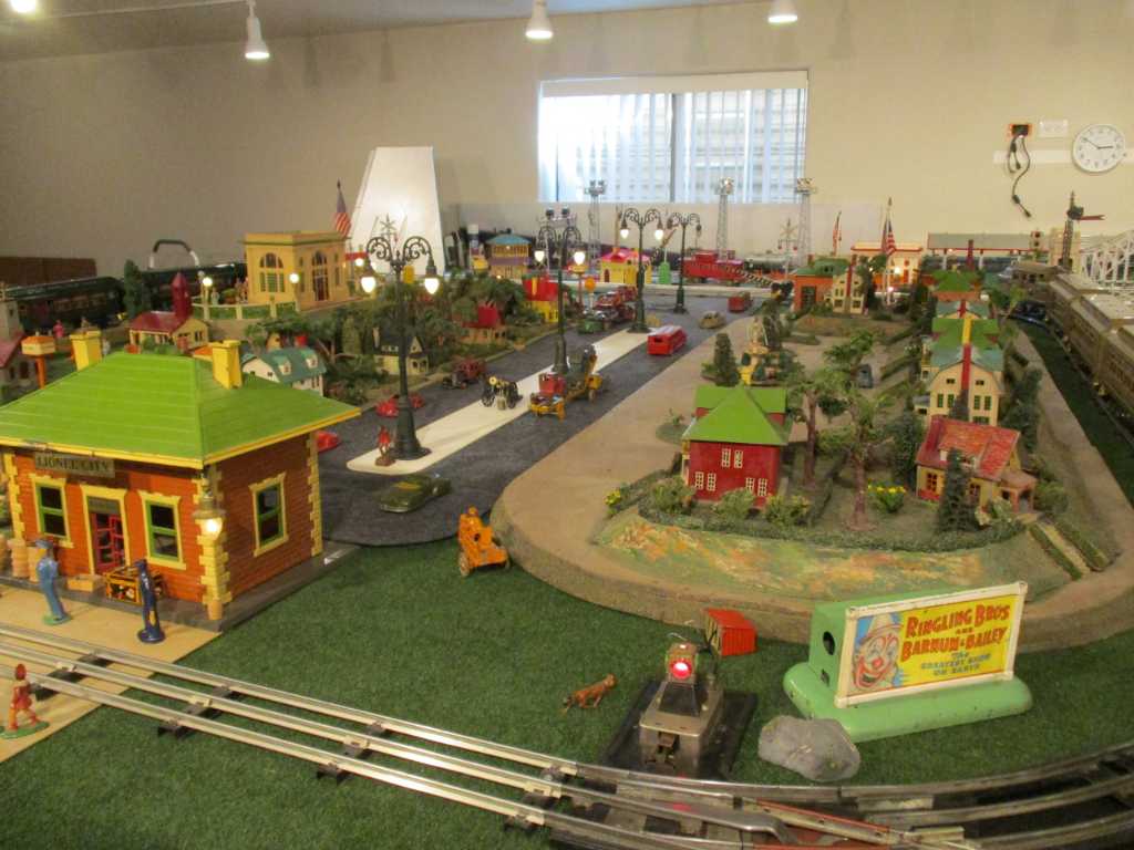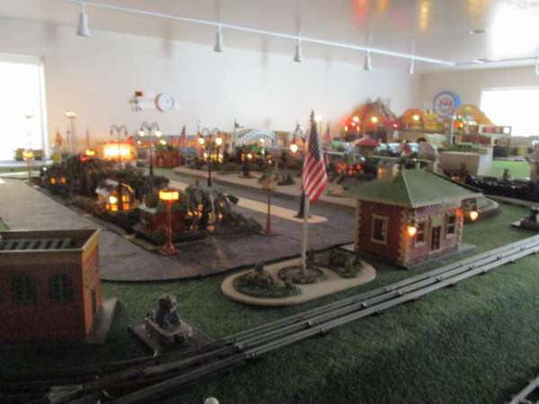 Here's pictures of the town area with the houses and streetlights in. All the exposed bulbs are vintage. I have a bunch of Kenton, Hubley and Arcade cast iron vehicles similar to the few that are already out to put on the roads.