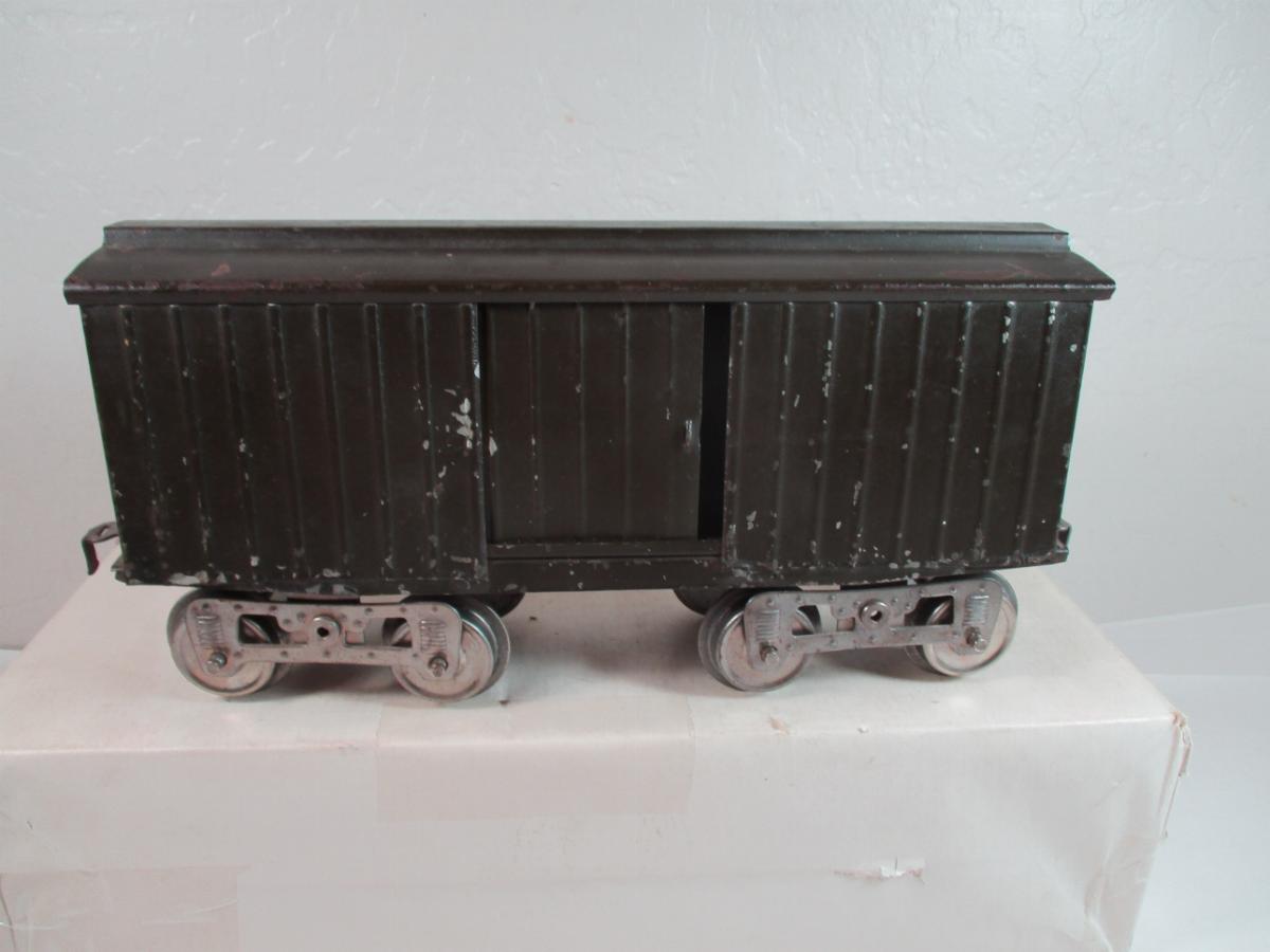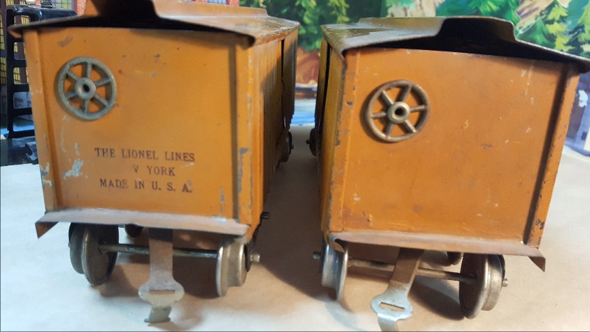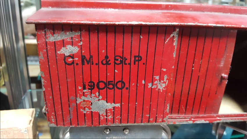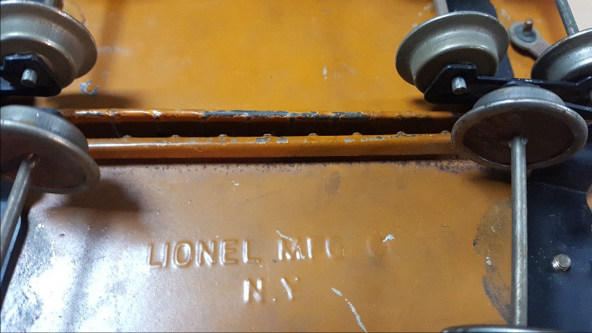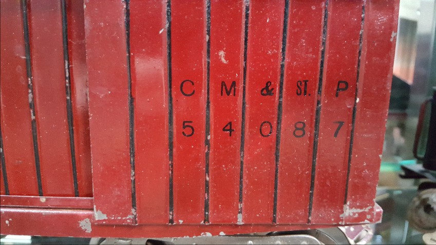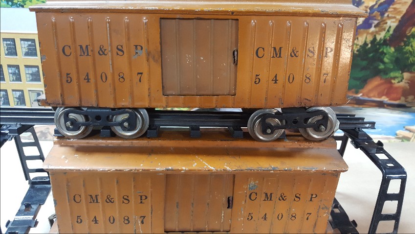 Here's a 114 CM&StP 54087. It has Lionel MFG embossed on floor, nickel plated trucks, Couplers are reattached and don't match. I think this is early and the crinkle coupler is correct.