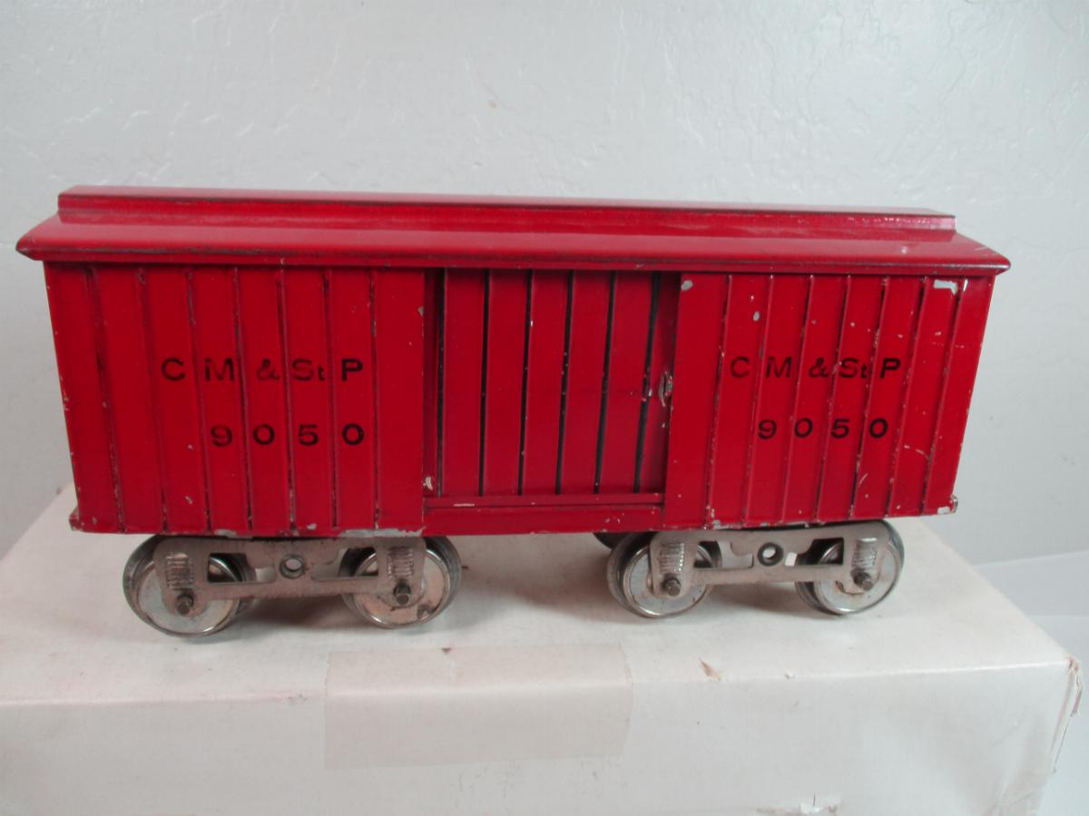 Early red 14 with emboosed sides and black lines. CM&StP 9050. Cream primer with Lionel MFG embossed on underside. This is my oldest 14 boxcar.