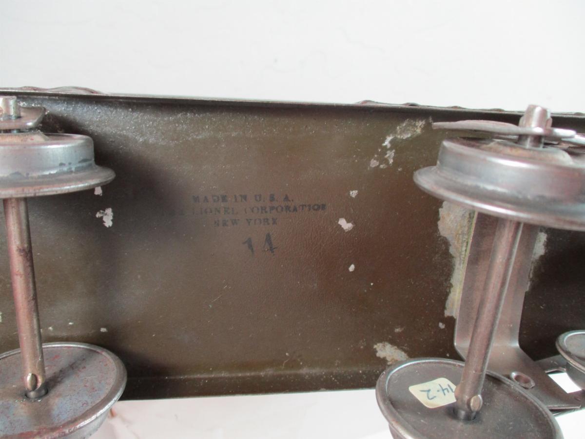 I shared this in an earlier thread, but here it is again for completeness. Dark Green 14 made for Harmony Creamer. It has 14 and Lionel Corp stamped on bottom.