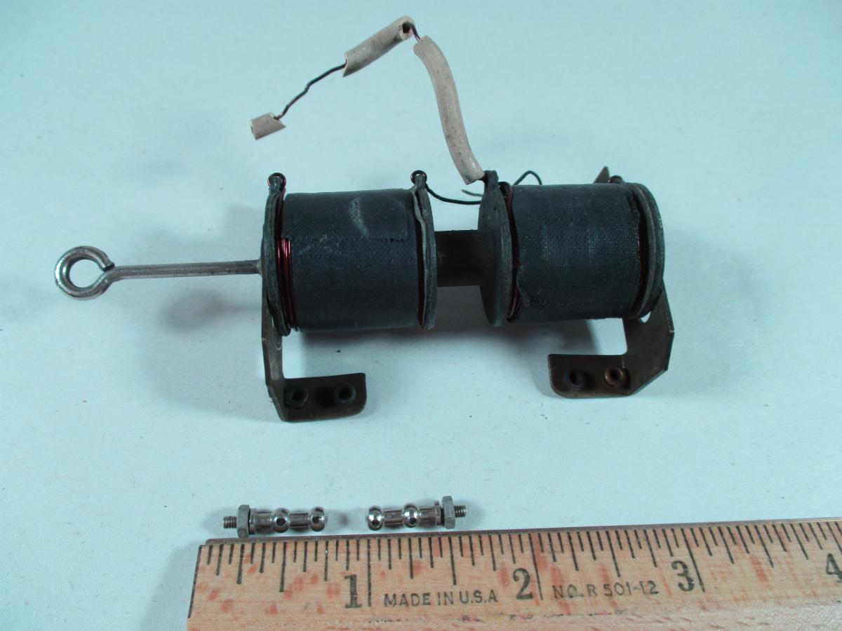 The double solenoid, looks like it is from a bell tender or a semaphore. The rod with loop on the end is similar to the attachment in a Lionel 80 or 82 semaphore, but the solenoid and bracket are different.