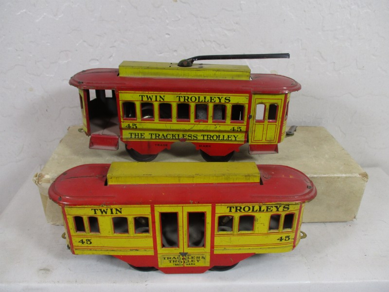 I bought a Ferdinand Strauss Twin Trolleys set at a show on Sunday. The seller had some wonderful English 1 gauge live steam from the 1920s that I find very tempting. Then he put out this much cheaper set which I immediately bought.