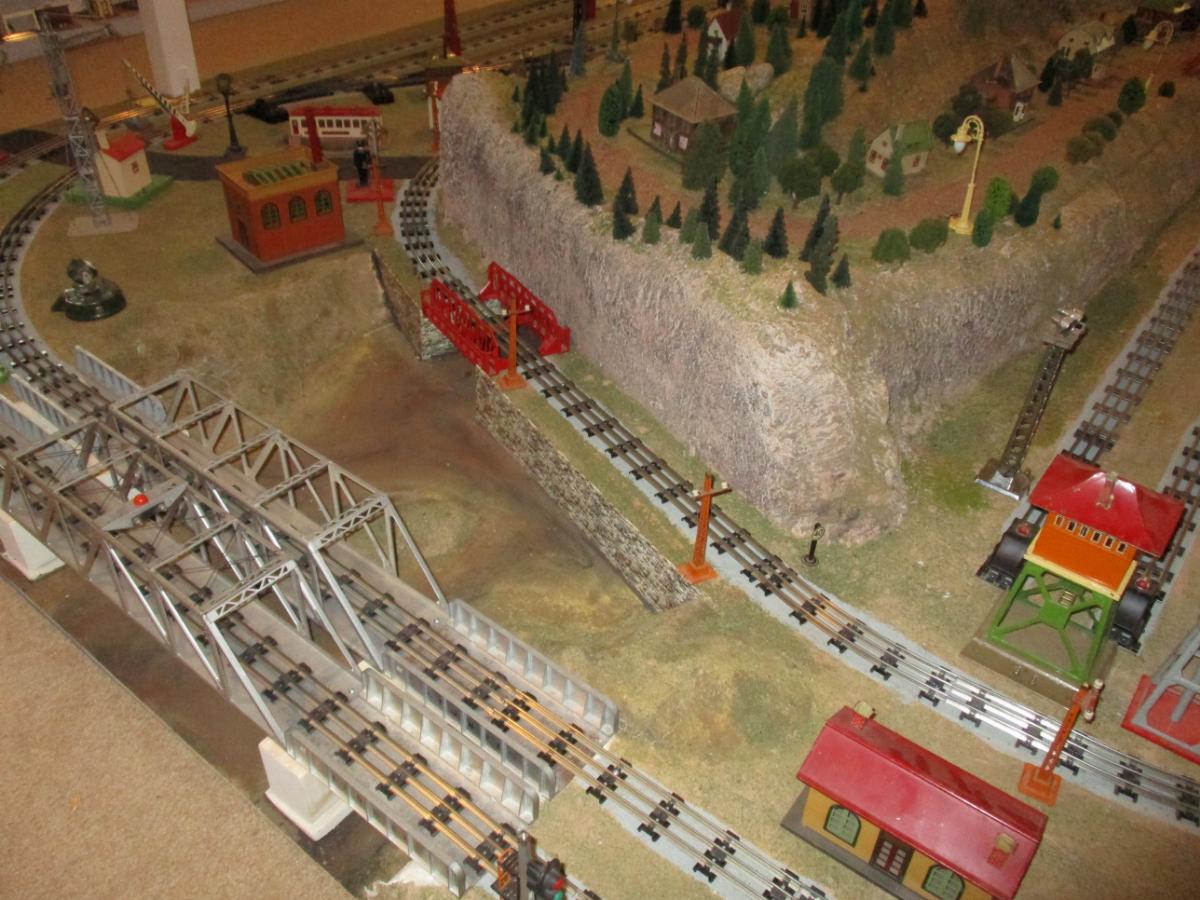 The west end of the layout with the ladder to the passenger yard, the end of the mountain, the Schoenhut village and the backside of the transformers. That's a difficult to find prewar 027  Lionel 1022 tunnel.