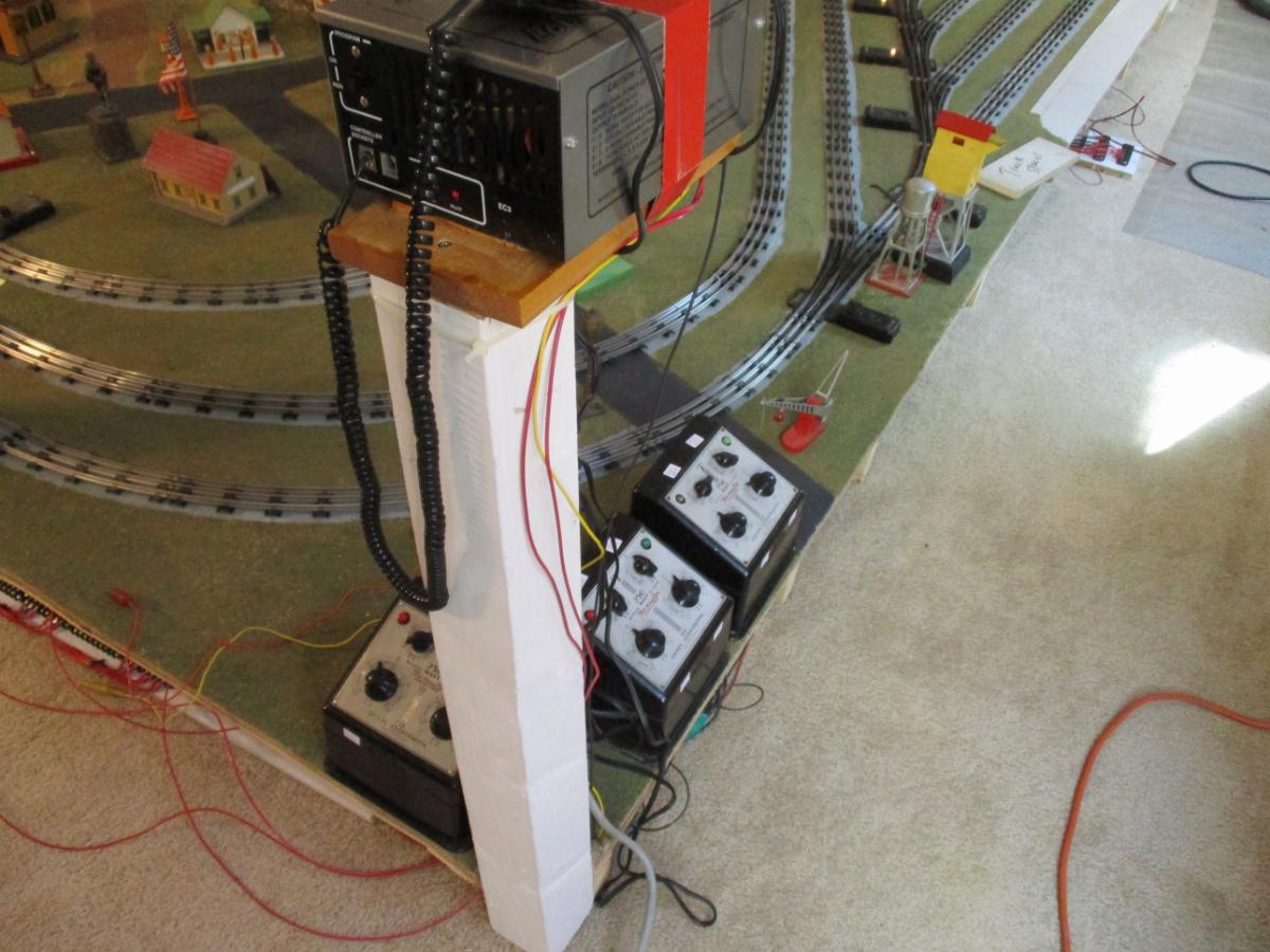 The handheld unit runs two trains. I could switch it so it does the middle and innermost loops. Then I can put a controller on the center post.