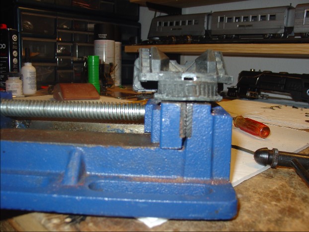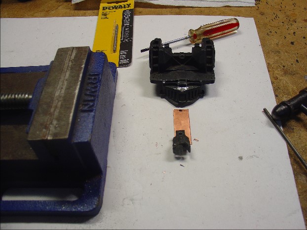 I cut a piece of copper to use as a place to attach to the pilot and a place to attach the coupler. I will now drill and tap a hole behind the teeth of the pilot for a 6/32 bolt. From here on it's going to be trial and error to get the coupler level with the tenders coupler that will be the lead engines tender.