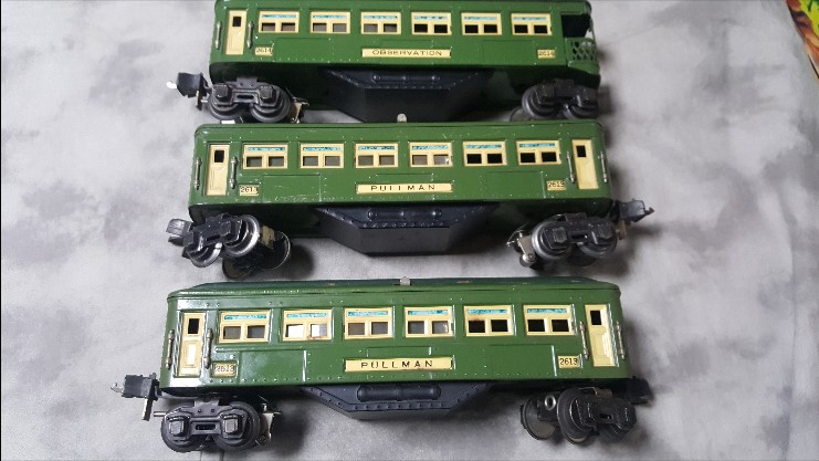 Here is one that I purchased as a set many years ago, but no boxes. Same era, 1940-41, uncataloged. It has a 229 with stamped number in plate depression, 2666TS plastic tender with high-step coupler, no whistle, 2613, 2613, 2614 state green cars.