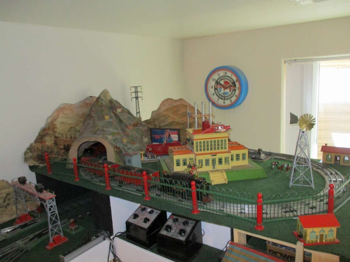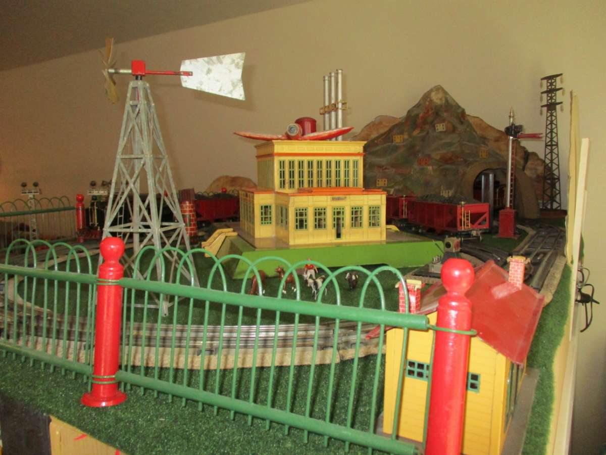 The 840 power station and the 140 sheet brass tunnel are the two biggest Lionel accessories.  The cardboard mountains are copies of original 1925 Lionel backdrops. The tin fence is from the 1930s. The windmill is from a 1950s kit.