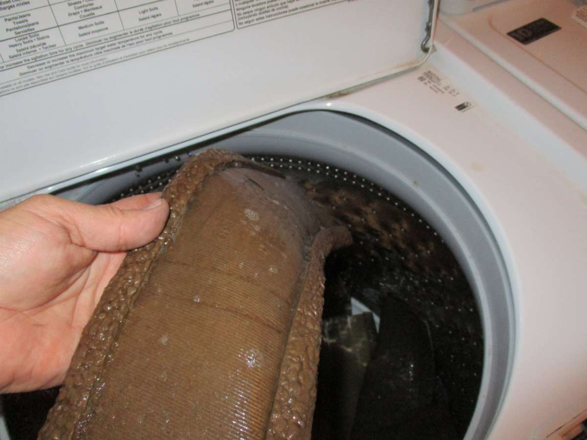 I started to do the track around the 840 powerstation, but the roadbed was filthy. I have a few boxes of original Lionel rubber roadbed from the 1930s. A lot of it is just trashed. I picked out enough to do the circle and switch and popped them into the washer: