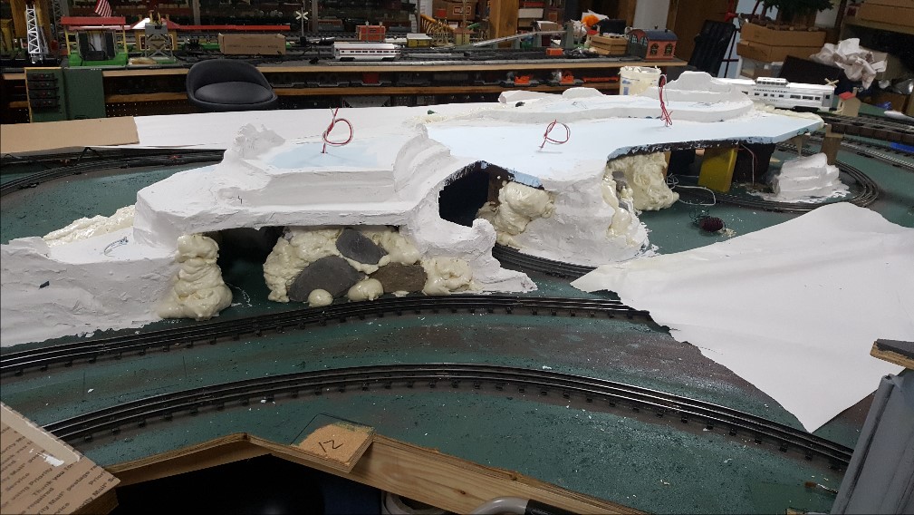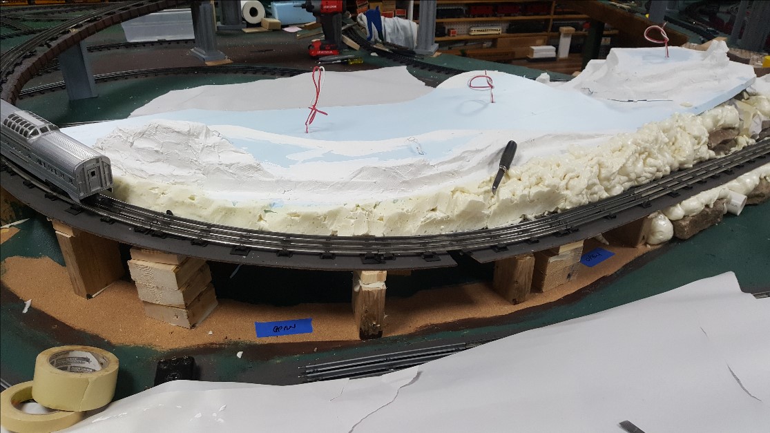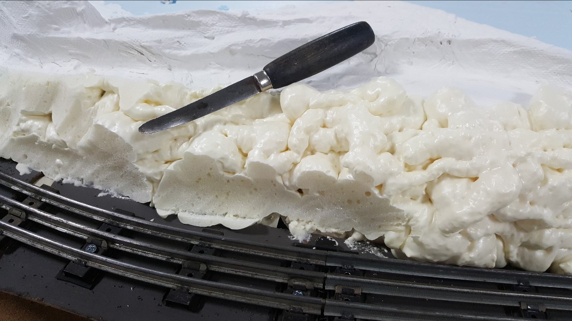 Recent progress on the Lake Shore Railway shows use of spray foam on the edges and carving into rock-formations with a sharp knife. The foam always expands much larger than expected, so I have to be careful when applying it. However, it is very easy to carve with a sharp knife to remove unwanted parts, after the foam dries. The wet foam is extremely sticky and difficult to remove from things you don't want it on, such as your fingers or clothes.