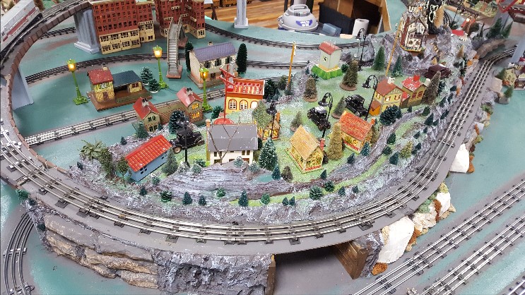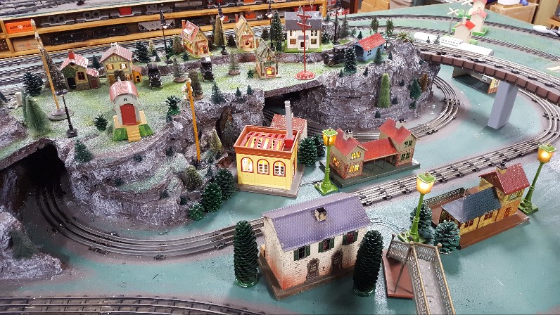 The mountain area on the Lake Shore Railway is near completion. It has been painted, grassed, populated with trees/shrubs, houses/stations/power station and a few cast iron vehicles. Lamp posts and lights in the houses have been wired. One end features the menacing ceramic house of a mad scientist complete with flashing lights inside. Most landscaping around the Franken-house is noticeably dead, and who knows what flows from the waste culvert at the base of the mountain.