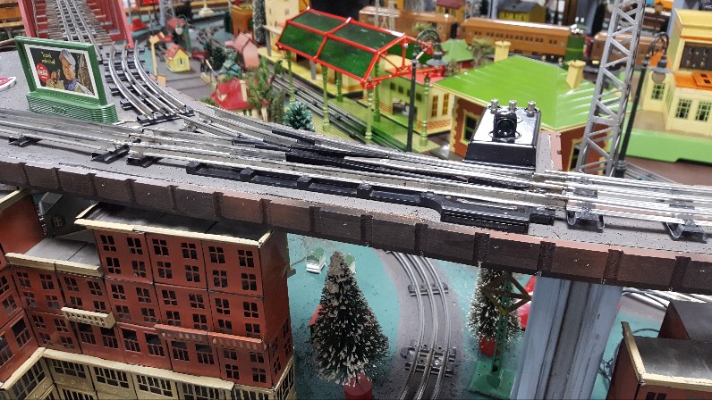 In the thread of Terry's layout I mentioned problems with modern Lionel switches. Here is a shot of the moving frog rail that leaves a gap and allows cars to pick-open the switch and cause derailment. Second shot is the location, 12" in the air, where the switch is being replaced. A derailment here would be a costly disaster, but good entertainment if you are an Addams Family fan.