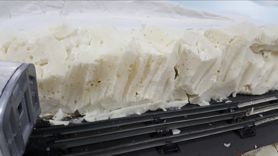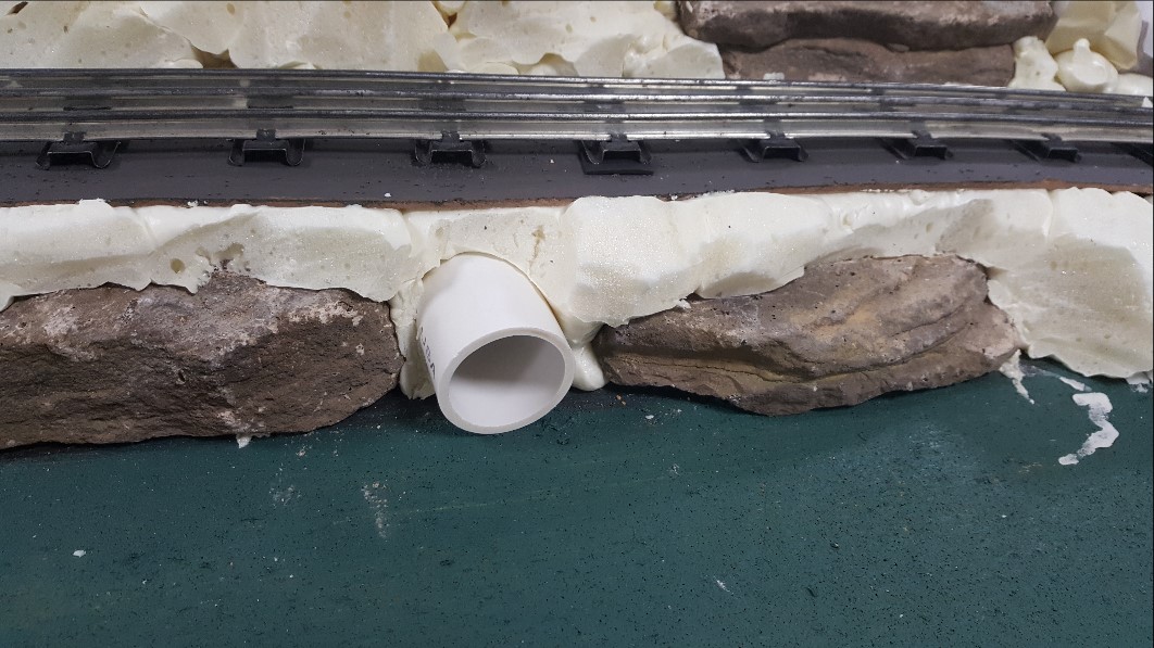 Recent progress on the Lake Shore Railway shows use of spray foam on the edges and carving into rock-formations with a sharp knife. The foam always expands much larger than expected, so I have to be careful when applying it. However, it is very easy to carve with a sharp knife to remove unwanted parts, after the foam dries. The wet foam is extremely sticky and difficult to remove from things you don't want it on, such as your fingers or clothes.