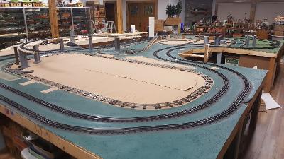 I have removed all the "stuff" from my layout that was there as staging for YouTube videos and am back to finishing construction. I had to remove part of the upper level structure so the perimeter could be painted green. I mix sawdust in with the latex paint to simulate landscape/grass. My Dad taught me this trick in the 1950's.