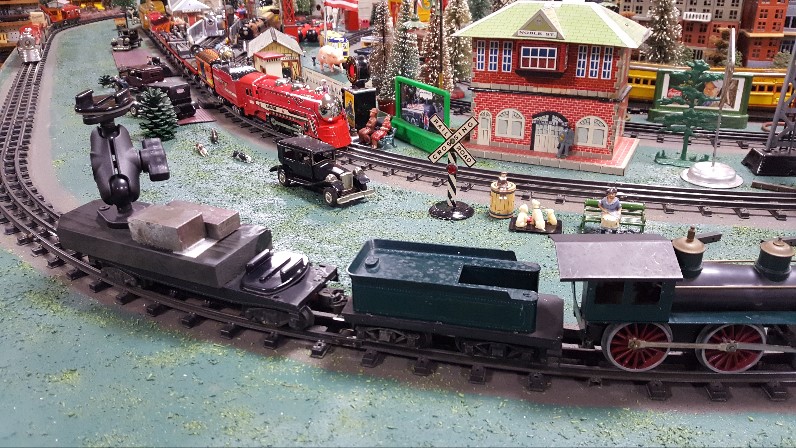 For more, see my Youtube videos of "the Lake Shore railway". I have recently published videos on Marx, Hafner wind-ups (all running!), Disaster Recovery-work trains and a Halloween special.