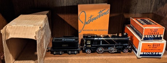 The same loco but with hand reverse lever in cab is 262 shown with diecast 4-wheel 257T.  Oddly when Lionel cataloged the 262 with 4-wheel cars it came with the 8-wheel 258T.