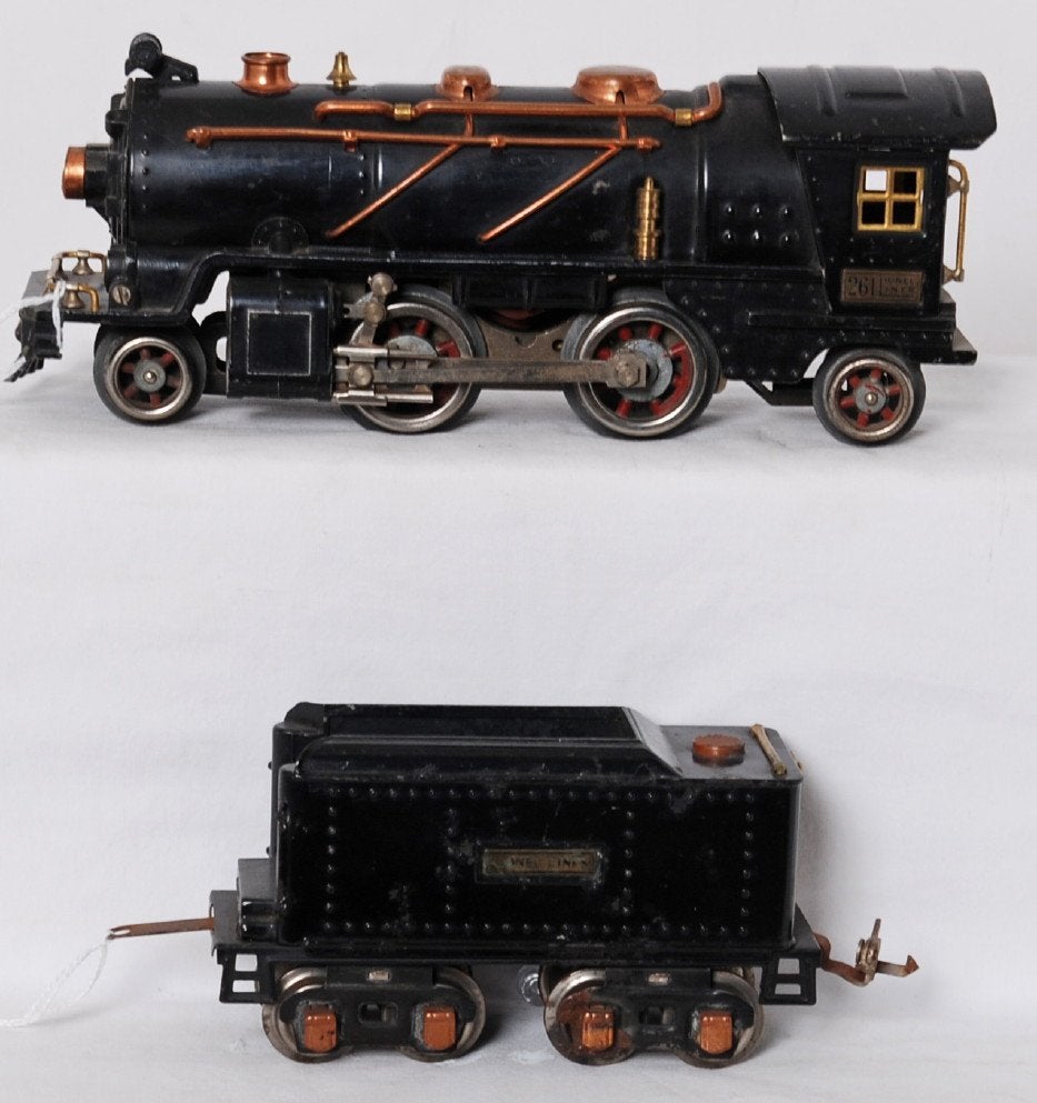 In 1935 the 1934 picture was shown in the catalog as a 261E with brass trim for separate sale with a 261T. It was also shown in a set with nickel trim and matching 650 series freight cars. They downgraded the loco from the top of the line cars it pulled in 1934 to smaller cheaper cars.