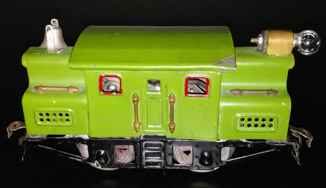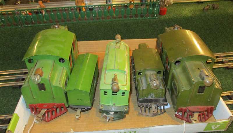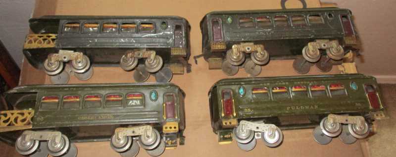 The woman's brother had a Lionel 6220 Switcher set with bell as his first train, and then bought used trains around the neighborhood with his paper route money. Not shown is a really dark - almost black - 318 with two 319 pullmans and a 322 observation in maroon with 100 series trucks, and an olive 8e with matching 337/338 cars. In O gauge there was some early maybe 152 set that only survived as peices of the motor and the bottom half of a 1918 era 820 boxcar. A beat up Blue streak, and an even more beat up gunmetal 238E freight set rounded out the trains.