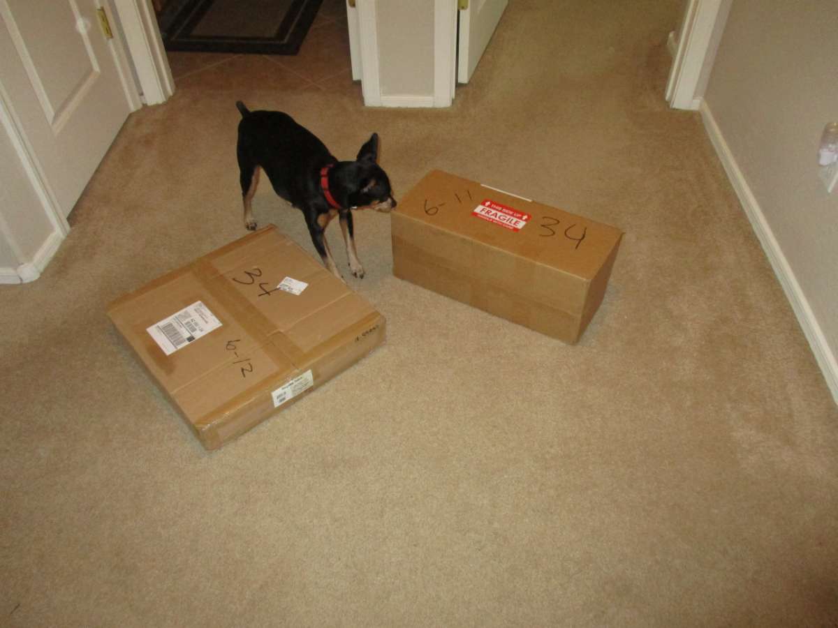 Before opening the boxes, the dog making sure no cats have sneaked in with the mail: