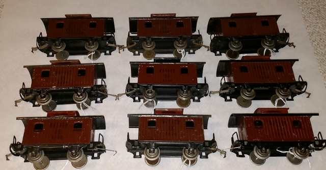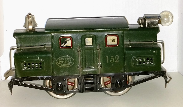 This one does have the hole in the end and with the wire handrails dates this to 1924. The earlier ones doesn't have the hole in the end. Collecting the 152 is harder than filling an inside straight. There are sooo many variations. I think I have 12 different. Mfg, corp, axle bushings, no axle bushings rivet coupler, slot coupler, 3 hole hoods, strap hoods, transition hoods, triangle brush plate, dog leg brush plate with caps, dog leg brush plate without caps, square brush plate, rivet brushes, crimp brushes, Nickel trim, brass trim, 154's stamped 152, 150's stamped 152, and on and on. And this doesn't even include the colors! Dark Green, Light Olive Green, Dark Olive Green,Light Grey, Dark Grey, Peacock, WHEW! I guess it all depends on how anal you are as to what you want in your collection.