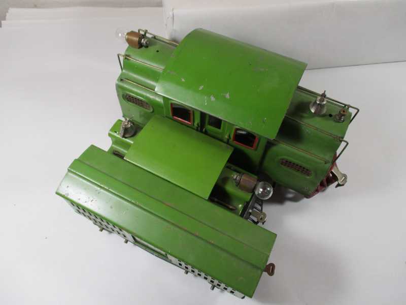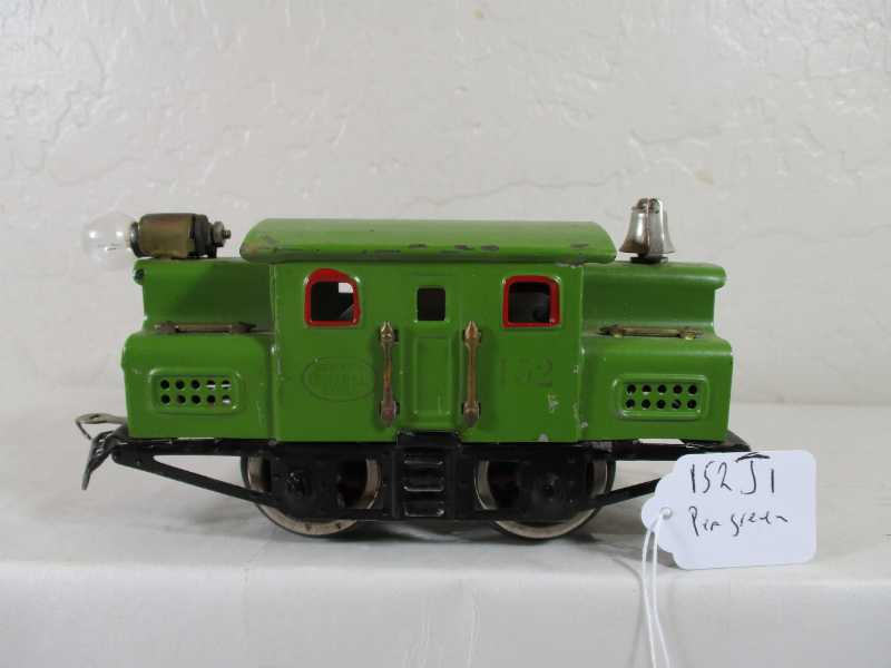 152j1 Pea green, stamped brass handrails and brass tone strap headlight, type 5 motor with brush tubes, black fiber with corp plate. Holes for 153 reverse.