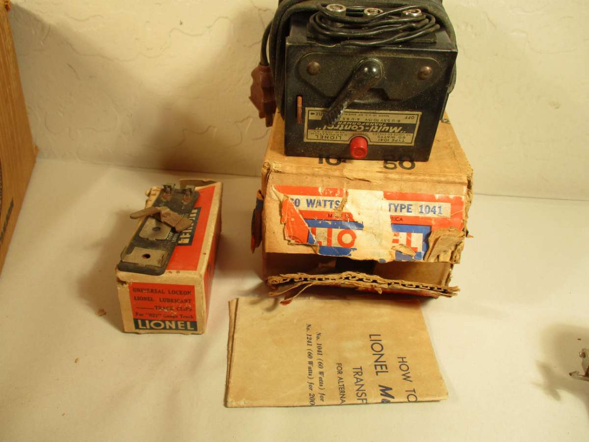 The transformer and boxed UTC lockon. There should be a bunch of track clips with this. That looks like the original black connection wires wrapped around the binding posts. They would have been in two coils inside the box with the lockon and track clips.