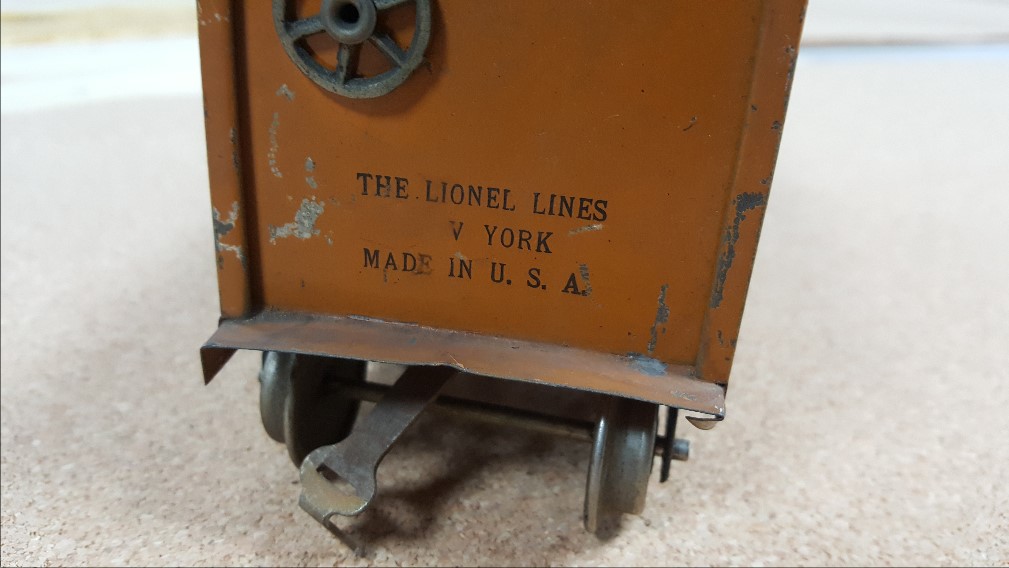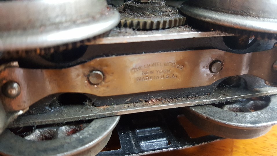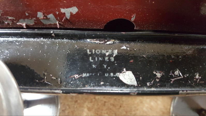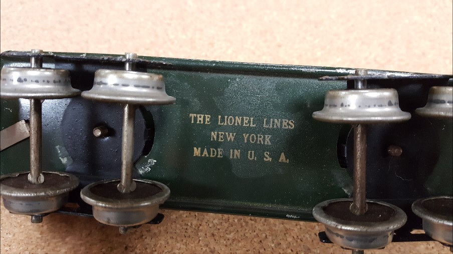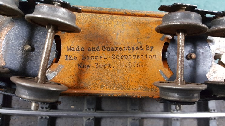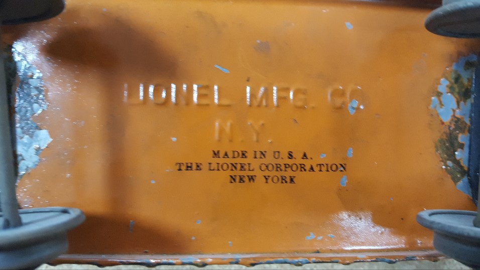 I was specifically interested to know if anyone had an example of the large Lionel Lines stamp on something other than the end of a 114 boxcar or underside a 601, 602