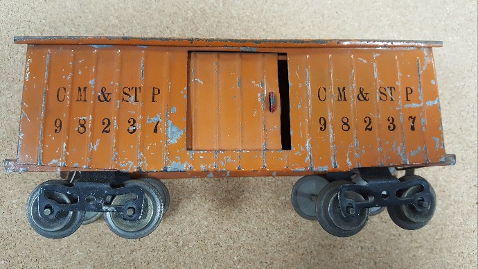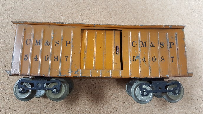 An unusual 114 boxcar. The floor, at least, was stamped with the MFG emboss prior to July 1918, but the car was completed and sold after incorporation. The floor shows both the MFG emboss and the Corporation stamp.
