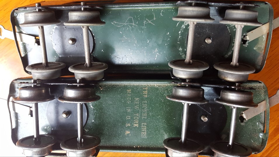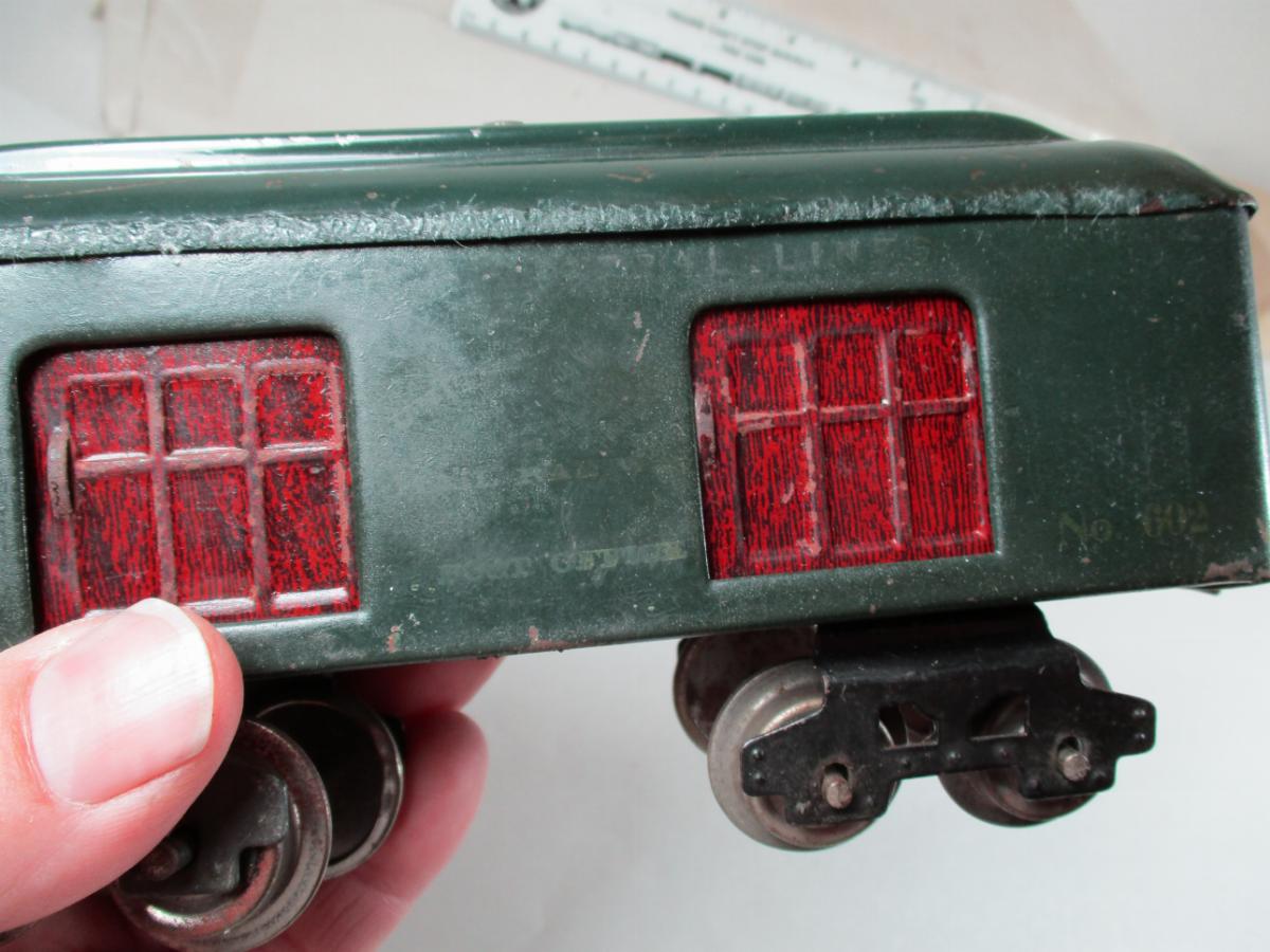 Terry, I'm not quite sure what you mean by "long trucks". The first O gauge trucks were the "half moon" trucks like on the car in your first picture. That 602 baggage is not the first one. The earliest 602 baggage has NO door handles, yours does have door handles. The one you show is possibly the 2nd or 3rd. That depends on the trucks and car bottom combination. The half moon trucks had no tangs so they were 'free wheeling". The earliest car bottoms had no curved slots for a tang to fit in as they were not needed. The 2nd body style had the tang slot to accommodate the tang on the common early truck like on your 2nd picture and door handles. So if your body has the handles, which it does, and half moon trucks, which it does,  then depending whether your car bottom has slots or no slots, yours is a 2nd or 3d generation car.