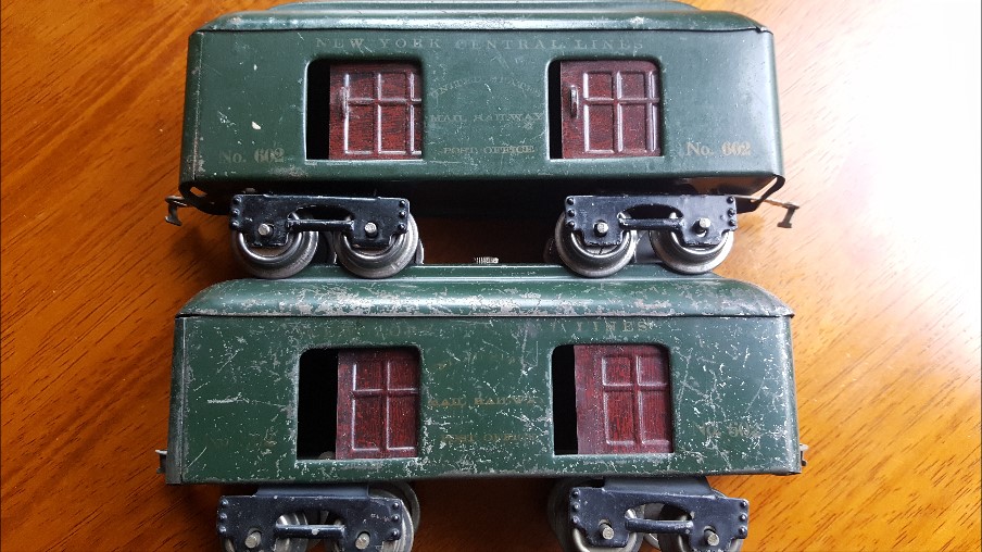 Terry, I'm not quite sure what you mean by "long trucks". The first O gauge trucks were the "half moon" trucks like on the car in your first picture. That 602 baggage is not the first one. The earliest 602 baggage has NO door handles, yours does have door handles. The one you show is possibly the 2nd or 3rd. That depends on the trucks and car bottom combination. The half moon trucks had no tangs so they were 'free wheeling". The earliest car bottoms had no curved slots for a tang to fit in as they were not needed. The 2nd body style had the tang slot to accommodate the tang on the common early truck like on your 2nd picture and door handles. So if your body has the handles, which it does, and half moon trucks, which it does,  then depending whether your car bottom has slots or no slots, yours is a 2nd or 3d generation car.