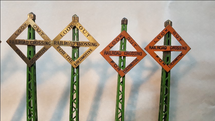 silver and gray with diecast (may be from a gateman) and the LL Jr type, also LL Ives and Winner, diamond is the same blank as used for the clock in this set, not same as an 068. Final one is Standard gauge size Hafner, with post and base made by Lionel, litho diamond by Hafner.