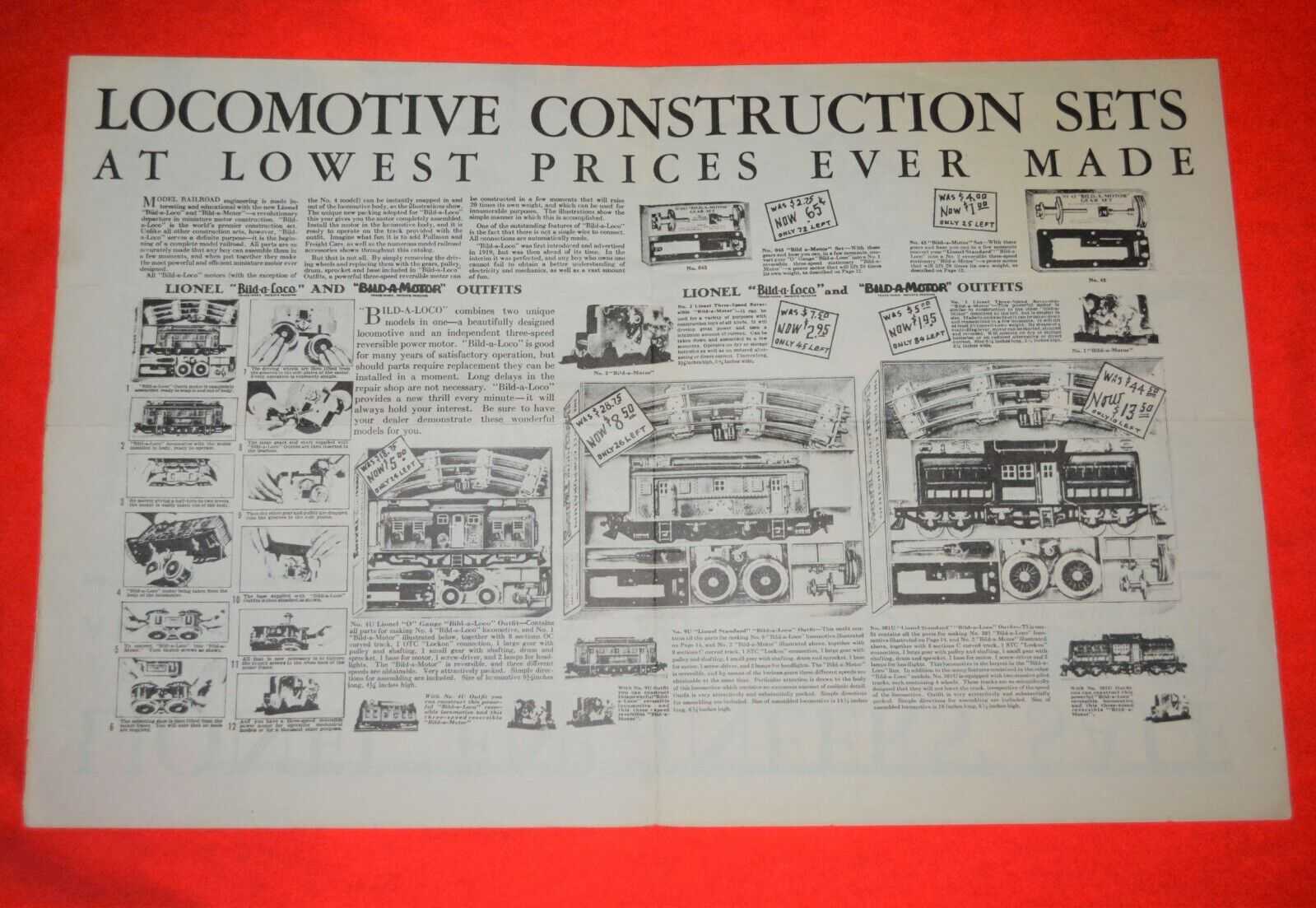 Lionel was using the 4U sets as contest prizes into the late 1930s. This folder shows how the expected demand for the bild-a-locos didn't materialize. These were last cataloged in 1929.