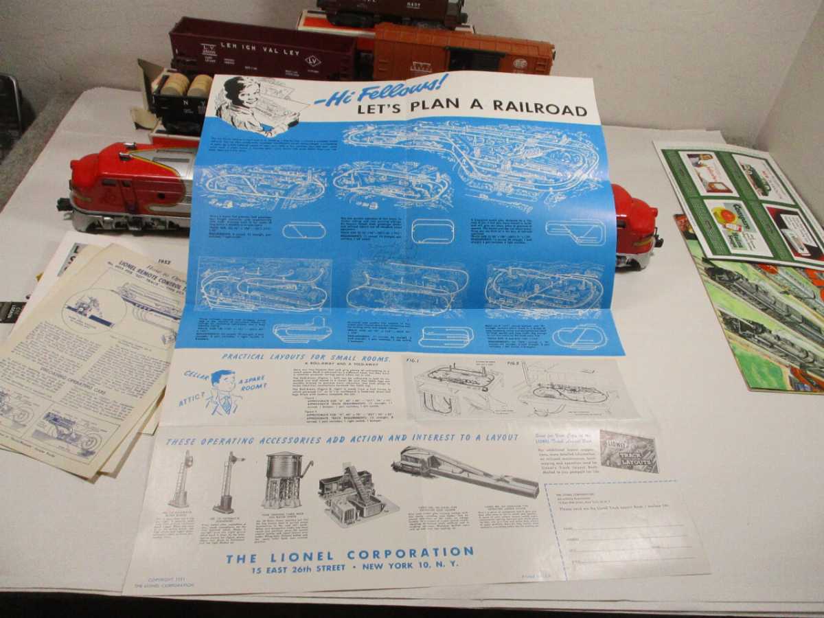 This is the top of the line set from 1951.  Set conatins a 2343 Santa Fe F3 AA pair and five cars.  This set was $70 new in 1951. The same set with a 6555 metal single dome tank car was offered in 1950 for $57.50, but the Korean war had put a premium on metal and caused rapid inflation.