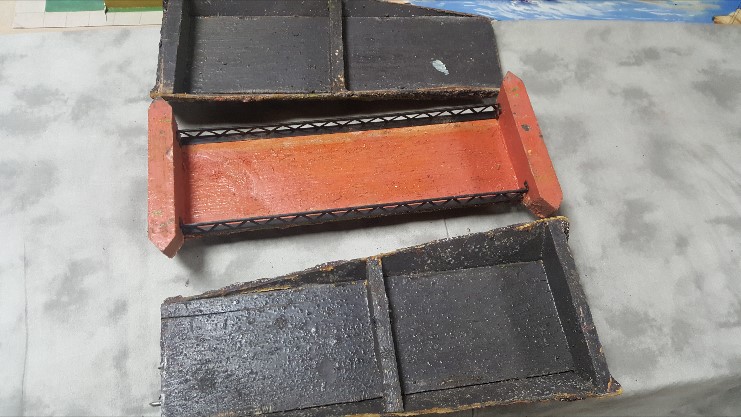 I have a 3 piece standard gauge bridge, 42" long overall, wood structure, some metal on center span and stamped details on ends of center span. Landscaping is composite material, track is early Lionel with split center pins. Is this an early 103 or 105? It is the same dimensions as the later enameled steel bridges. The metal girders on the center span are not Erector.