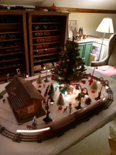 Nice table layout. Did you use a white sheet or Christmas felt for the snow. Looks like you have the Lionel/Shonhut station. Looks nice with the lights. Happy Holidays!