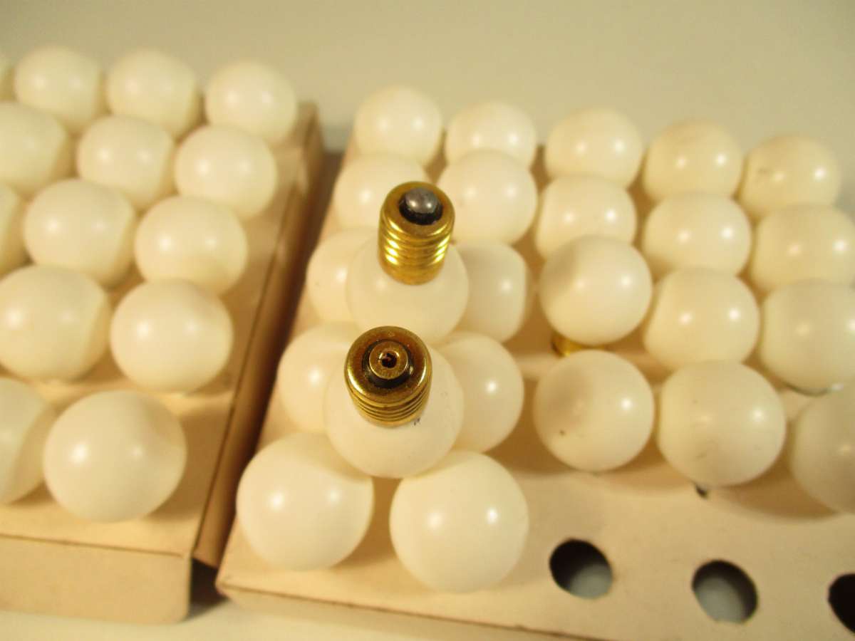 Here's something that I've never seen before. I have boxes  of old bulbs I put aside, and pulled out two flats of 14V large globe white frosted.  I am wiring the buildings and use these large bulbs because I like the glow. These are Japanese bulbs probably from the 1950s.
