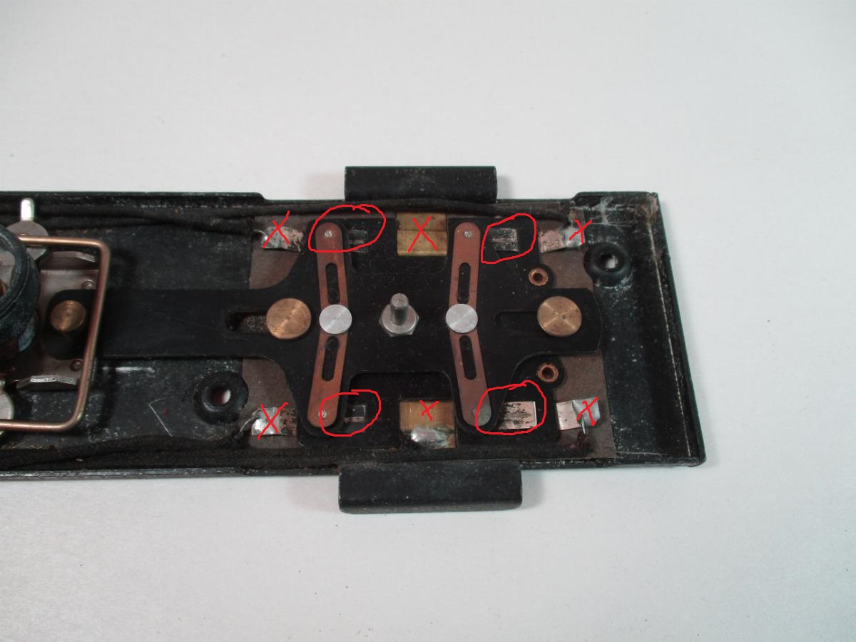 The areas marked with red Xs are where connections are made with pins that do not move. The two center ones are for the positive current and don't need to be cleaned if you are using the fixed voltage pin. The four corners are for the current from the non-derailing rails. A simple wipe for these is enough. If the non derailing feature doesn't work when you test it, you can spend more time examining these connections.
