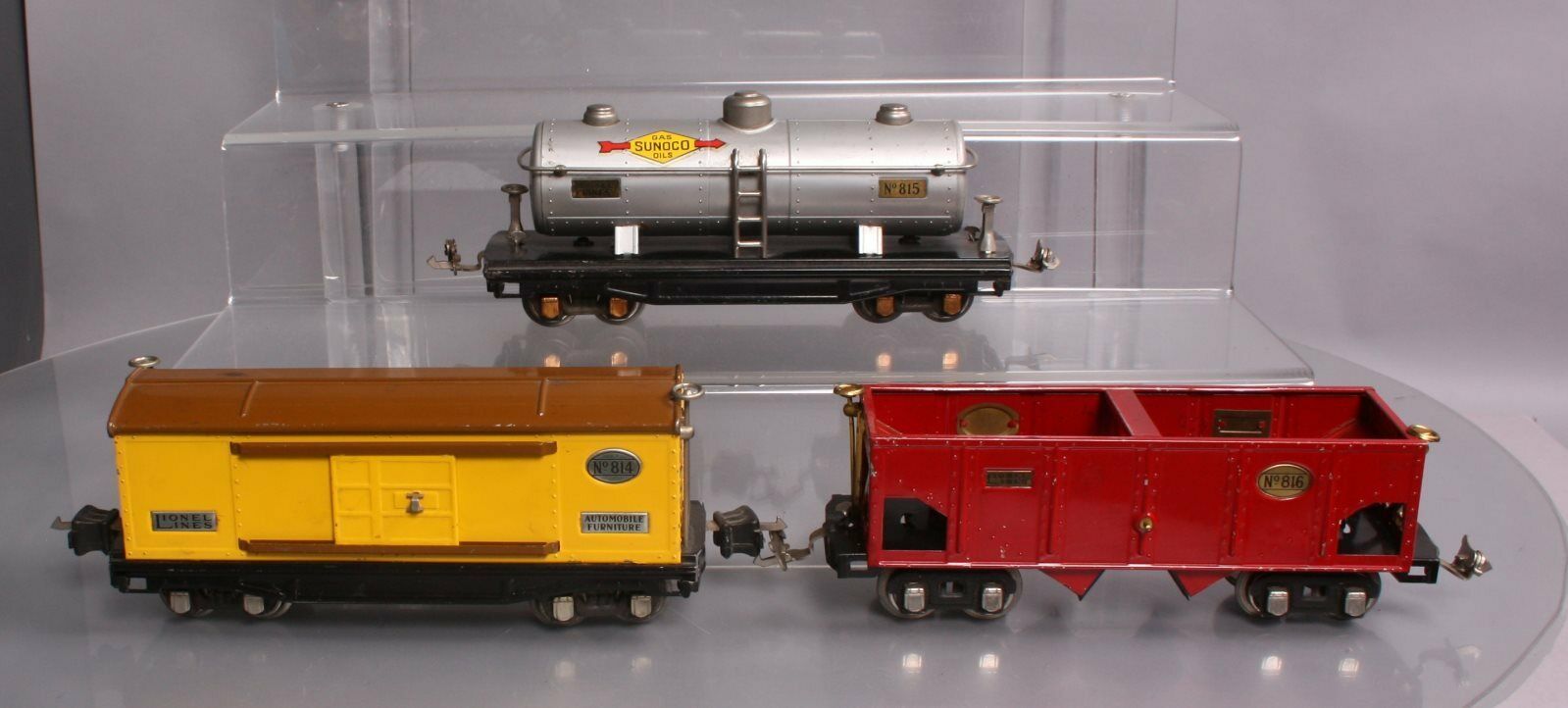 • The boxcar with the two triangle truck with tang for box coupler (can't see it in photo) and nickel journals from very late 1934 early 1935.