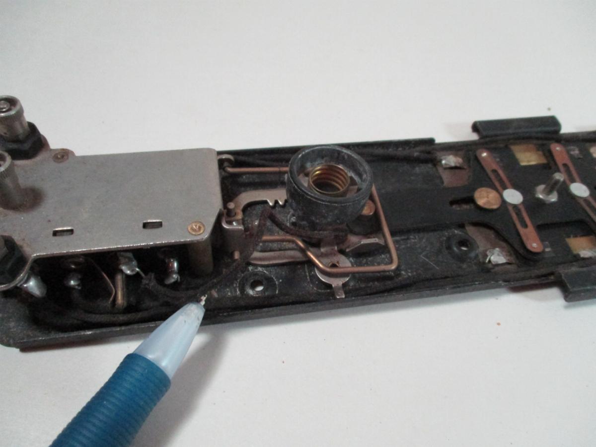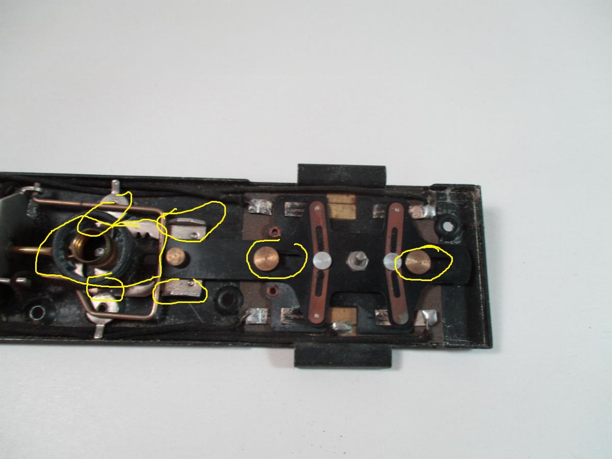 The next step is to clean the movement and check operation. NEVER USE OIL ON THE SWITCH MOVEMENT. It will attract dust and cause problems. I brush the switch down with a dry brush and the use a dry toothbrush on the areas circled in yellow to insure there is no dirt blocking the movement.