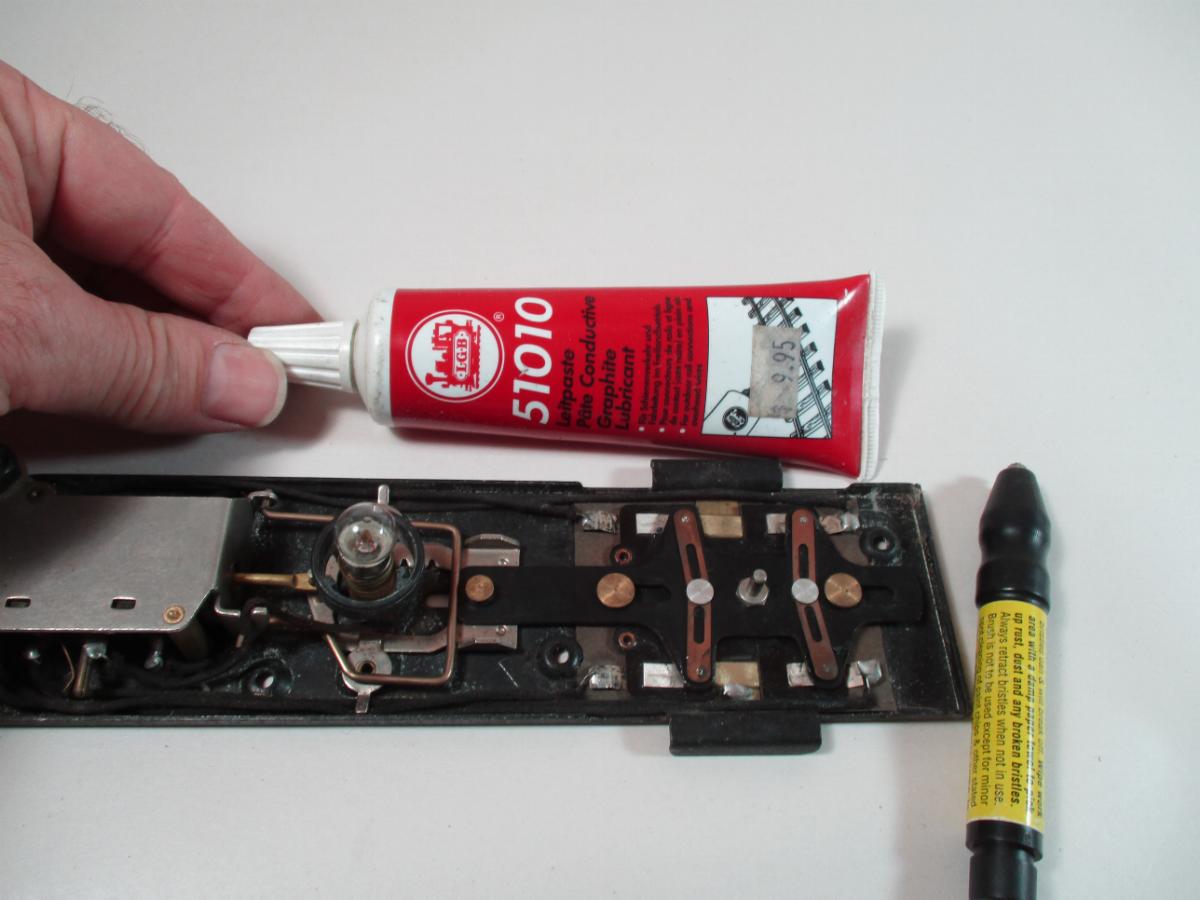 Once the movement is fluid, put a drop of dielectric grease on the four slide contacts. I put a small drop on two of the contact plates and then use a finger to move to it to the other plates. This is an optional step, but I've found the grease helps the switch contacts work for longer. The LGB brand shown works good and has a smaller hole than the Permatex brand availible at any auto parts store.